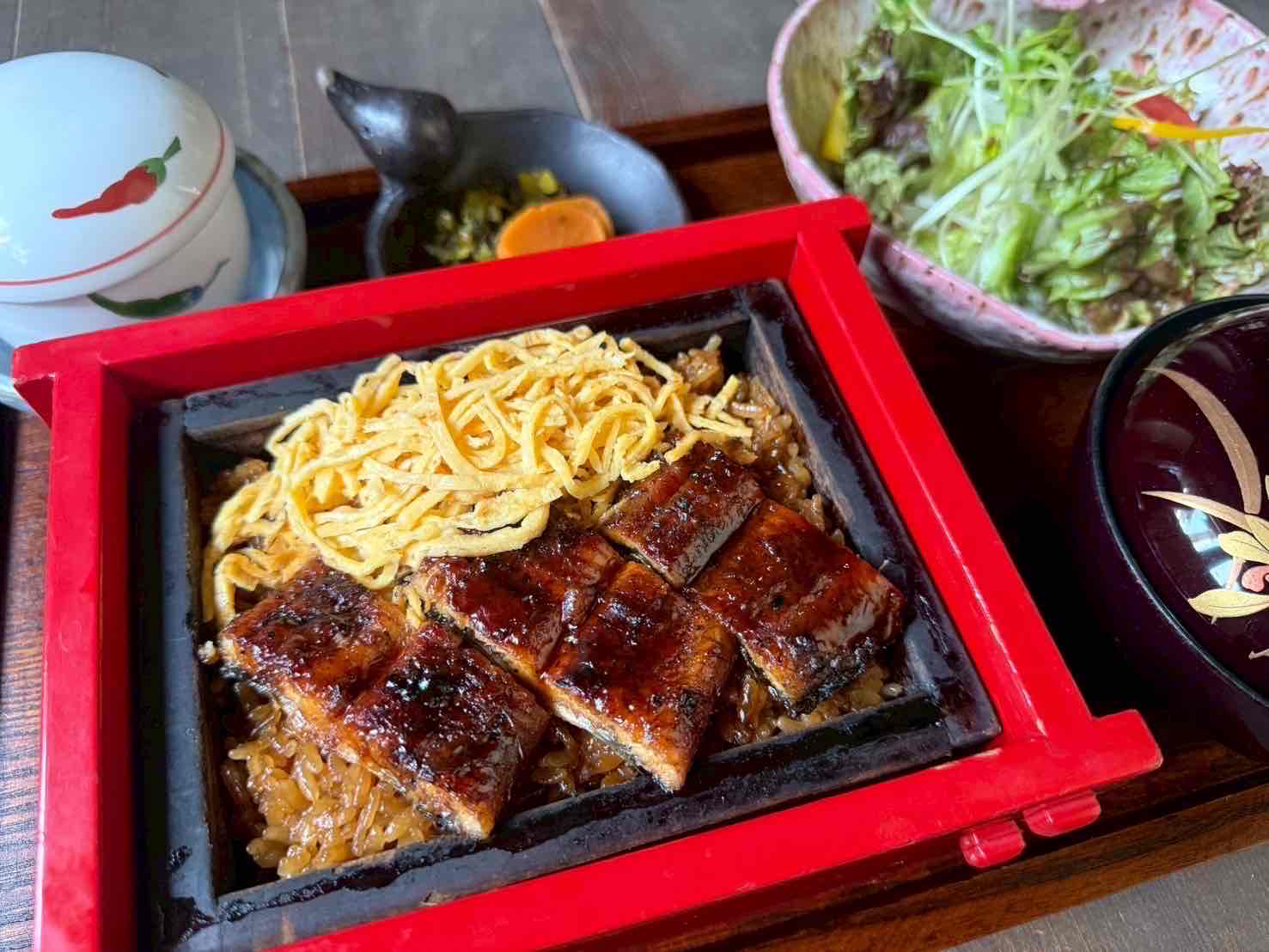 秘伝のタレを絡めたご飯の上に、香ばしく焼き上げた鰻の蒲焼と錦糸玉子をのせ、せいろで蒸し上げて仕上げます。